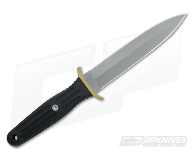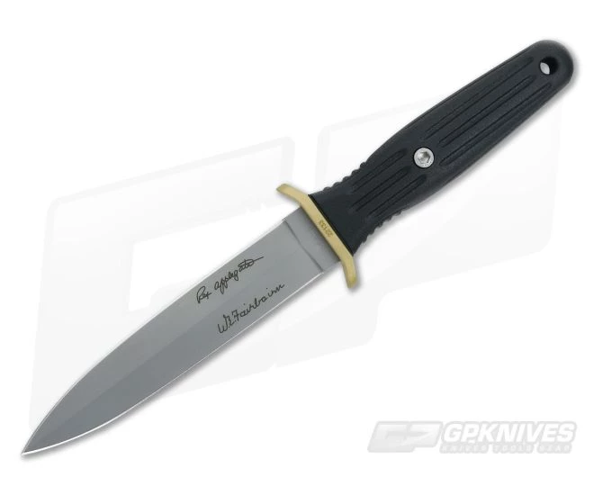 Boker A-F 12 Combat Knife with a double ground bead-blasted 440C dagger style blade. The handle is injection molded nylon with grooves running lengthwise for a secure grip. Steel weights have been positioned inside the handle for the perfect feel and balance. Bead-blasted brass guard has been serialized. Includes a kydex sheath and tek-lok for multiple carry options. This combat knife is an Applegate-Fairbairn collaboration design.