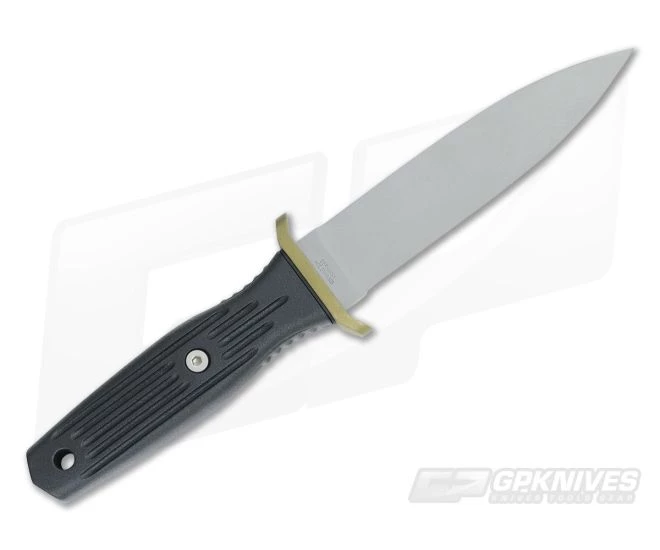 Boker A-F 546 Boot Knife with a dual edge bead-blasted 440C dagger style blade. This combat knife, an Applegate-Fairbairn collaboration, has a full tang blade that has been hollow ground on one side. The handle is injection molded nylon with grooves running lengthwise for a secure grip. Steel weights have been positioned inside the handle for the perfect feel and balance. Bead-blasted brass guard has been serialized. Includes a kydex sheath and tek-lok for multiple carry options.