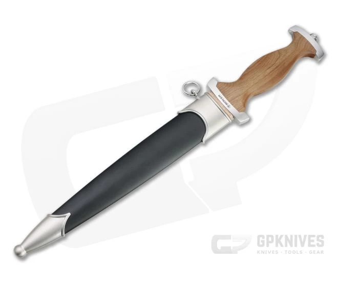 Handle: The unusual, internally curved design of the pommel and the cross guard are characteristic of the Swiss Dagger and can be traced back to the early 13th century. Found in the authentic design of this handmade piece, Boker delivers these elements in high quality stainless steel instead of the classic iron. The guard and pommel frame a handsome cherry wood handle all perfectly fit together along with the blade.