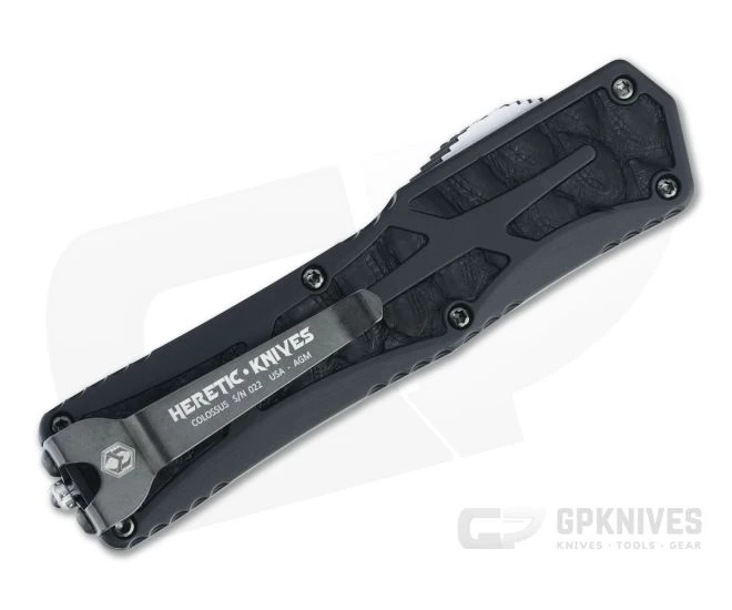 The Heretic Knives Colossus is a tactically inspired double action, out-the-front automatic that comes in just under the length of the Manticore-X for easy carry while being more robust. Anodized aircraft grade aluminum handles are machined with strategic scallops for traction, giving a sure grip for operation of the dagger-like blade via the double action mechanism. This custom version has a hand ground, double edge Vegas Forge Reptilian Damascus blade, black anodized aluminum handle frame, black python inlays and black DLC coated hardware. Serial Number: 022