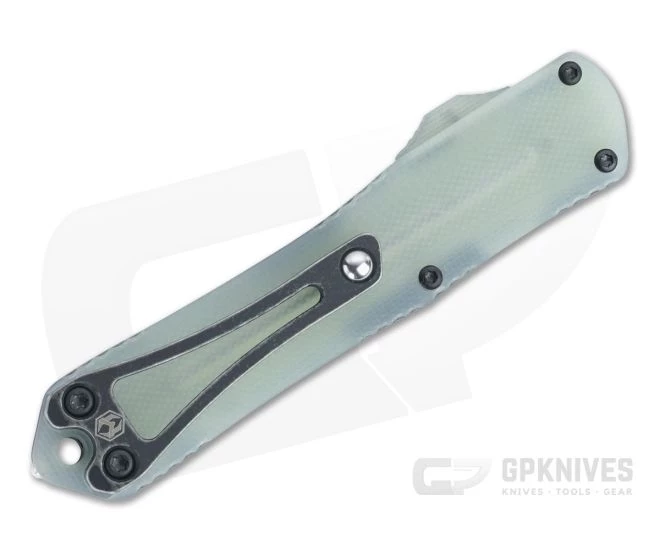 The Heretic Knives Manticore-S is the smallest of the Manticore Series of double action, out the front, automatic knives. The scaled down Manticore-S has the same contoured, 3D machined, aircraft grade aluminum handle with traction scallops around the edge for a comfortable and secure grip in the hand. This version comes with a Battleworn black coated Elmax double edge blade, black handle frame and translucent Jade green G10 back cover and slide.