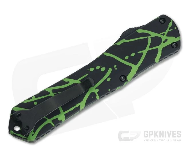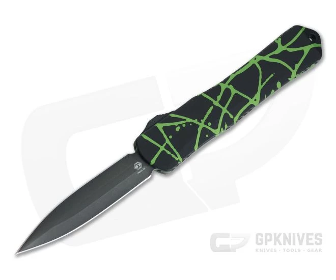 The Heretic Knives Manticore-X is the largest of the Manticore Series of double action, out the front, automatic knives. The Manticore-X has a countered, 3D machined, aircraft grade aluminum handle with strategically placed scallops around the edge that delivers a comfortable and secure grip in the hand. This version comes with a double edge, tumbled DLC, CPM-S35VN blade and Black with Green Splash anodized handles.