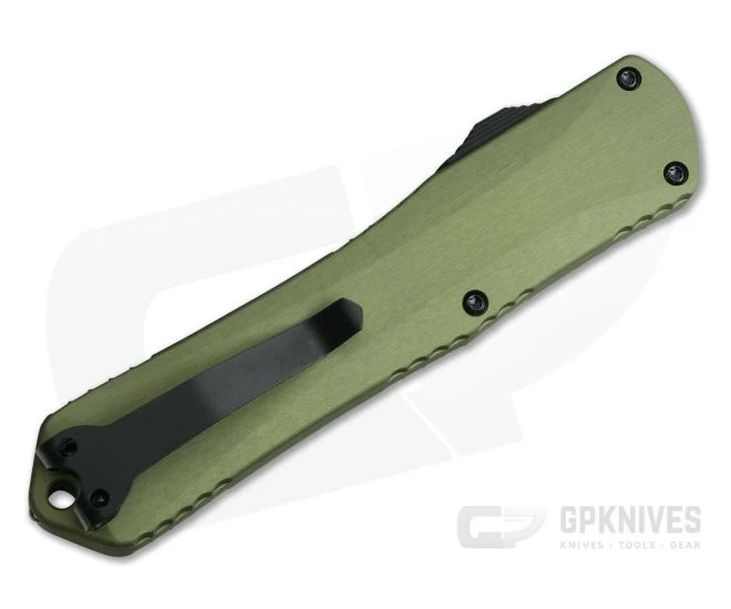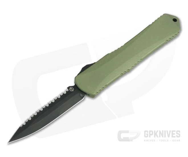 The Heretic Knives Manticore-X is the largest of the Manticore Series of double action, out the front, automatic knives. The Manticore-X has a countered, 3D machined, aircraft grade aluminum handle with strategically placed scallops around the edge that delivers a comfortable and secure grip in the hand. This version comes with a double edge (one plain, one serrated), tumbled DLC coated, CPM S35VN blade and Green anodized handles.