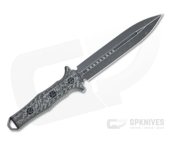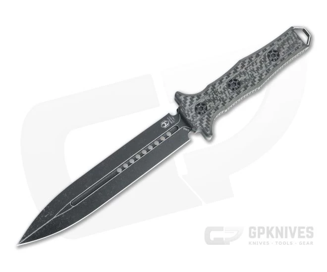 Handle: The full tang blade supports chamfered 3D machined carbon fiber handle scales that are securely attached with custom Battleworn Black Torx hardware. Deep jimping machined on the spine provides exceptional traction, while the cross guard keeps the hand safely off the blade.