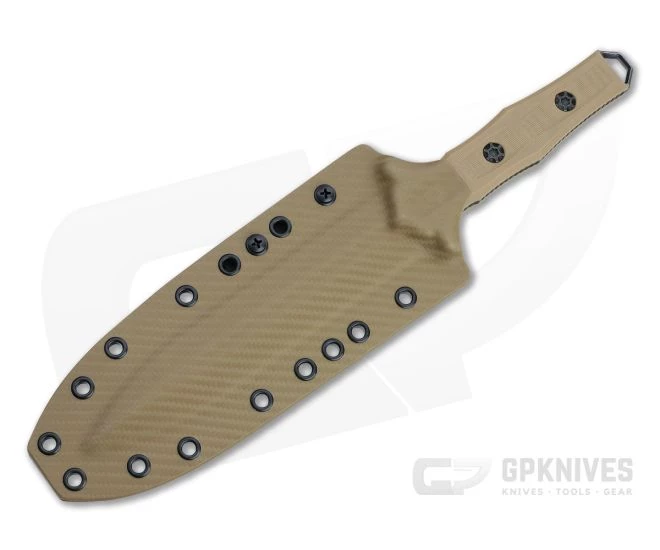 Handle: The full tang blade supports chamfered 3D machined G10 handle scales that are securely attached with custom stainless steel Torx hardware. Deep jimping machined on the spine provides exceptional traction, while the cross guard keeps the hand safely off the blade. Hardware features matching Battleworn black coating.