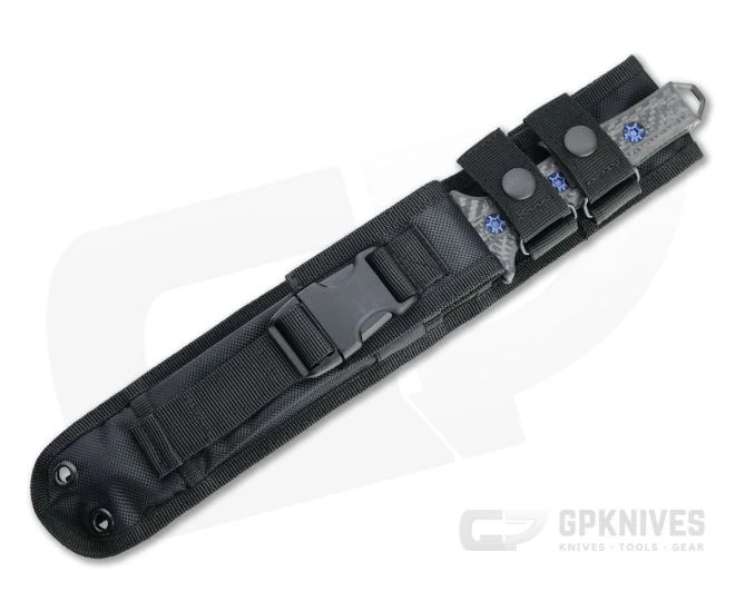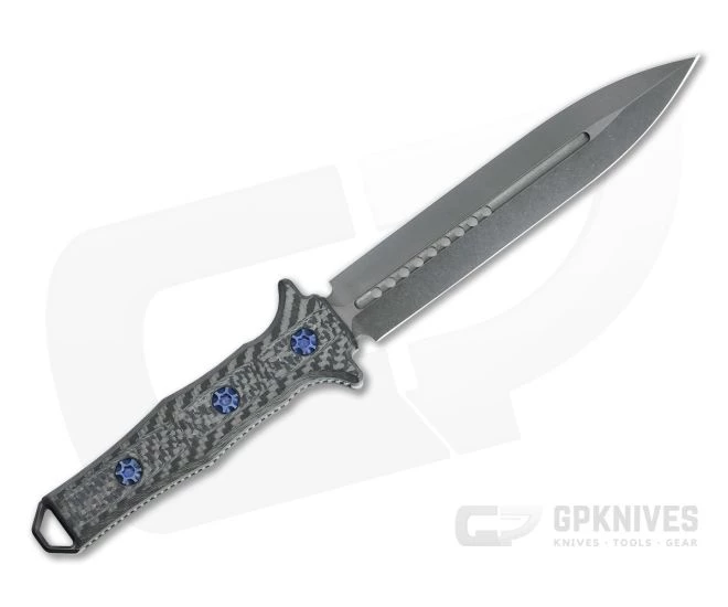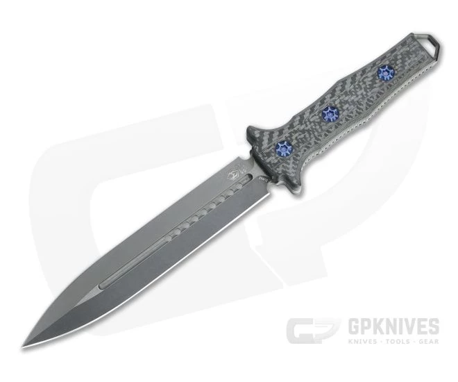Handle: The full tang blade supports chamfered 3D machined carbon fiber handle scales that are securely attached with custom blue anodized Titanium Torx hardware. Deep jimping machined on the spine provides exceptional traction, while the cross guard keeps the hand safely off the blade.