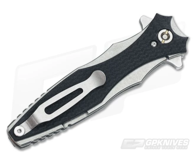 The Handle: The frame is fully stonewashed titanium built with finger grip comfort in mind. The genius is both sides are machined in the same fashion giving its user the same, reliable grip every time no matter which hand the Maximus is in. Speaking of grip, Hinderer added a Black G10 onlay to both sides of the frame creating a usable accent. Construction consists of a single copper standoff at the end of the handle. Also included is a tip up carry titanium pocket clip that can be flipped to either side with tab insert.