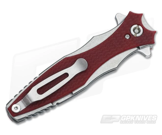 The Handle: The frame is fully stonewashed titanium built with finger grip comfort in mind. The genius is both sides are machined in the same fashion giving its user the same, reliable grip every time no matter which hand the Maximus is in. Speaking of grip, Hinderer added a Red G10 onlay to both sides of the frame creating a usable accent. Construction consists of a single satin Ti standoff at the end of the handle. Also included is a tip up carry titanium pocket clip that can be flipped to either side with tab insert.