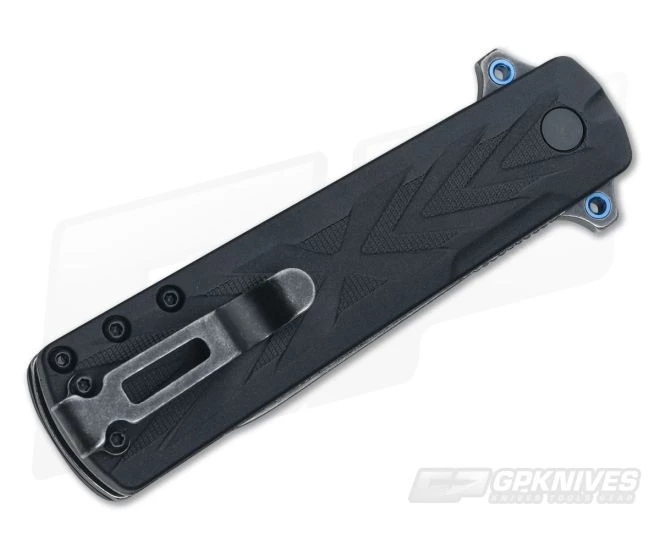 The Handle: The Glass-filled Nylon handles are textured for a secure grip and attached via Torx hardware to sturdy stainless steel liners. The liners have matching BlackWash finish one of which forms the liner lock mechanism. The liners are joined in an open back construction by three blue anodized barrel spacers for a subtle color accent. The knife carries via a reversible, tip-up, stainless steel deep carry clip.
