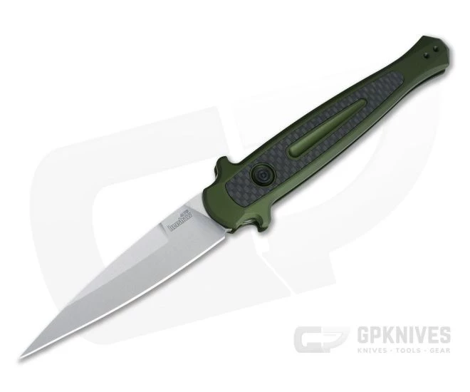 The Launch 8 push button automatic knife from Kershaw Knives is tactical, practical and lightning fast. Clean lines and modern good looks on the Launch 8 are reminiscent of classic Italian Stilettos. This version comes with a stonewashed CPM-154 balde and an Olive Green anodized aluminum handle with front Carbon Fiber insert.