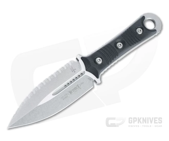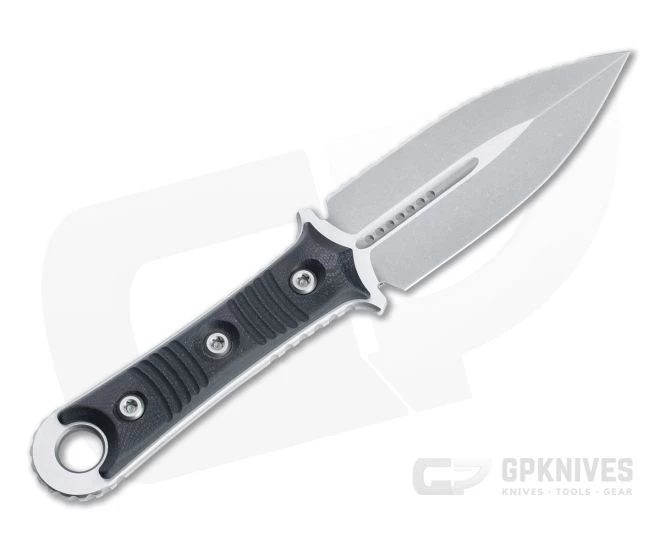 Designed by custom knife maker Sebastijan Berenji, the principle of Borka Blades, the Microtech SBD dagger is an aggressive, tactical fixed blade with a wide double edge dagger blade. Full tang construction sports dual guards, crowned spine and contoured and textured handle scales for a secure, comfortable grip. This version comes with black G10 handle scales and a stonewashed blade with dual cutting edges, one plain and one fully serrated.