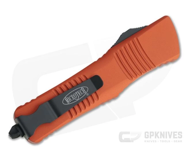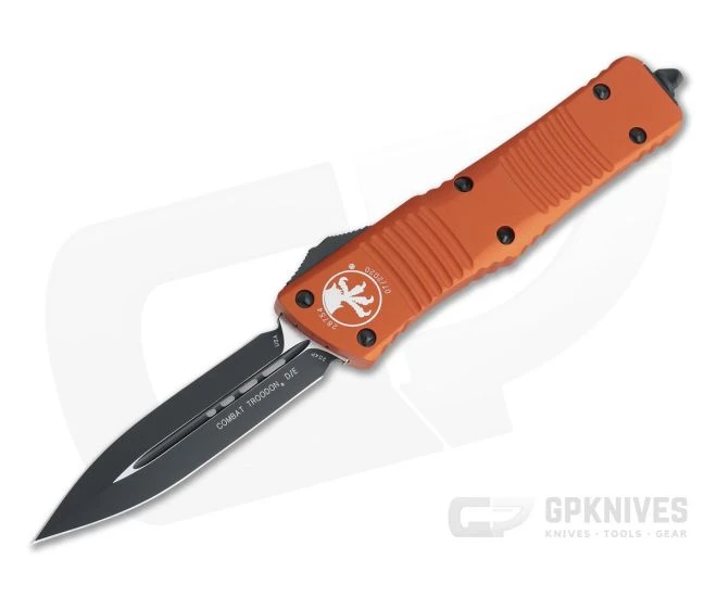 The Double Edge Combat Troodon out-the-front automatic knife by Microtech is a substantial tool, popular among military, law enforcement and first responders. Its large size lends itself to situations requiring a more robust cutting tool while remaining slender enough to keep on your person daily. Like its bird-like dinosaur namesake this Troodon is ready to strike. This version comes with a black Cerakote coated, CTS-204P double edge blade and Orange anodized aluminum handles.