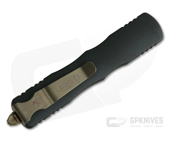 Handle: Smooth and contoured black coated 6061-T6 aluminum delivers an ergonomic and comfortable feel in-hand as well as a visually appealing shape. Several sections of machine-grooved texturing around the outsides enhance traction in hand. The handle’s construction is completed with Microtech’s proprietary hardware, glass breaker end and pocket clip all in a matching Bronze Finish. The clip is marked with individual serial number and date of production.