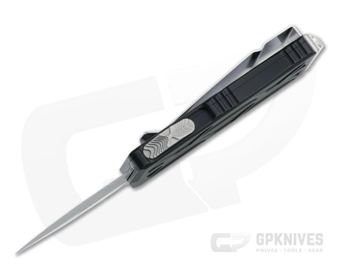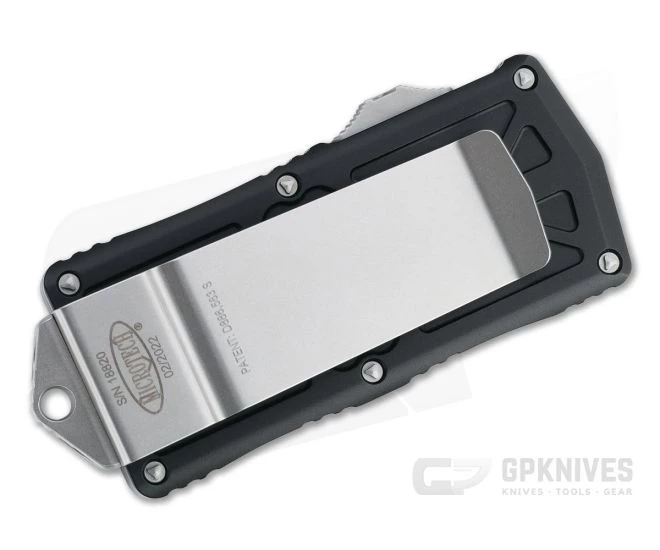The California legal Exocet is a dual action mini out the front automatic knife from Microtech that’s one of the most friendly for everyday carry. The compact size is perfect for watch pocket or key ring carry and the oversize clip doubles as a money clip for in pocket carry. This version has a black handle and stonewashed double edge M390 blade with one fully serrated cutting edge.