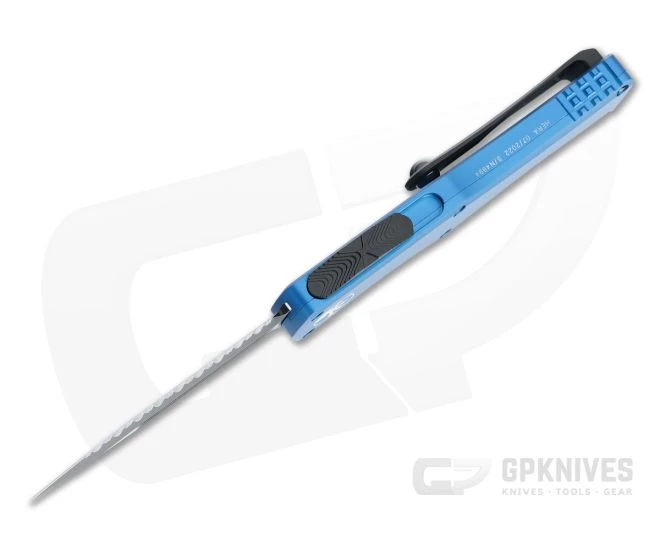 The Microtech Hera is a stylish out-the-front automatic similar in size and design to the standard Troodon with more dramatic, sweeping lines with deep chamfered edges, perfect for your daily carry collection. This version comes with a two-tone black double edge blade with one fully serrated edge and blue hard anodized aluminum handle with black hardware.