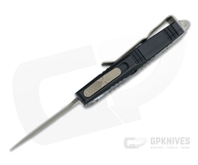 The Microtech Knives Troodon out the front automatic knife is a substantial tool while still retaining a compact size that can be easily carried every day. Now available in a Mini version with sub-2 inch blade, the Troodon offers a compact cutting tool with lightning fast deployment. Named after a bird-like dinosaur from the Campanian Age, the Mini Troodon is ready to strike. This version comes with a bronze Apocalyptic double edge M390 blade, matching hardware and black anodized aluminum handle.