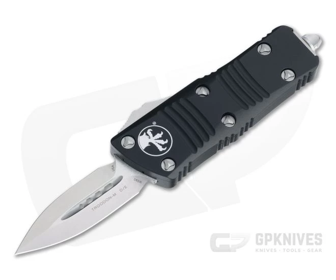 The Microtech Knives Mini Troodon out the front automatic knife is a substantial tool while still retaining a compact size that can be easily carried every day. Now available in sub-2 inch blade Mini version, the Troodon offers a compact cutting tool with lightning fast deployment. Named after a bird-like dinosaur from the Campanian Age, the Mini Troodon is ready to strike. This version comes with a black anodized aluminum handle and satin finished M390 double edge blade.