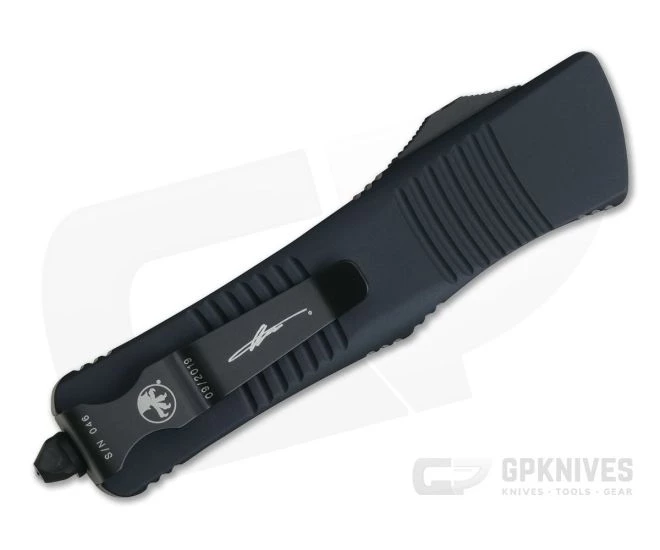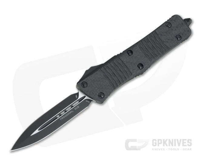 The Microtech Knives Troodon out the front automatic knife is a substantial tool while still retaining a compact size that can be easily carried every day. This knife is elegant enough for dress carry while being a fully capable cutting tool. This Tactical version is equipped with a double edge blade of black coated CTS-204P and a black hard anodized handle with Carbon Fiber top. The Troodon is named after a bird-like dinosaur from the Campanian Age and is ready to strike.