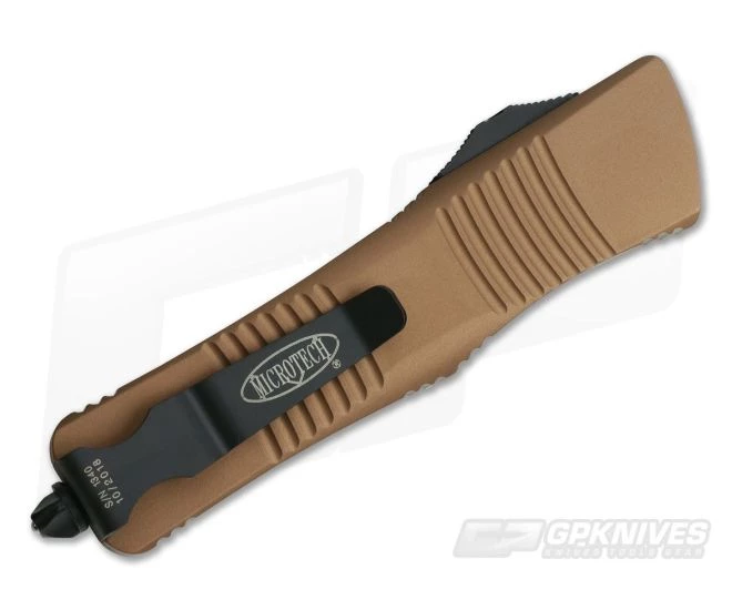The Microtech Knives Troodon out the front automatic knife is a substantial tool while still retaining a compact size that can be easily carried every day. This knife is elegant enough for dress carry while being a fully capable cutting tool. This version is equipped with a double edge blade of two-tone black Elmax and Tan, hard anodized handle. The Troodon is named after a bird-like dinosaur from the Campanian Age and is ready to strike.