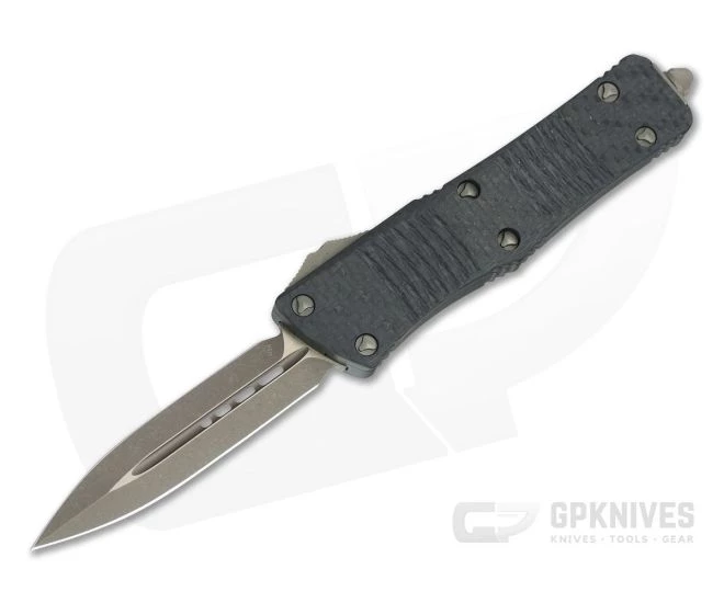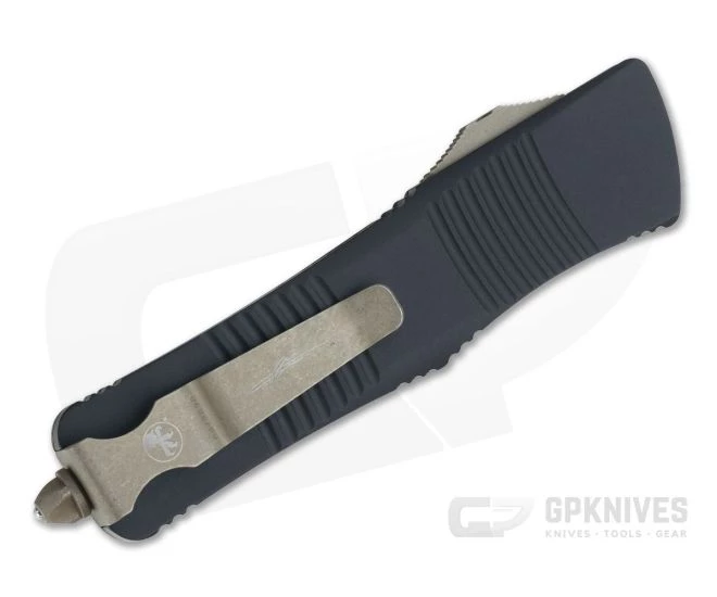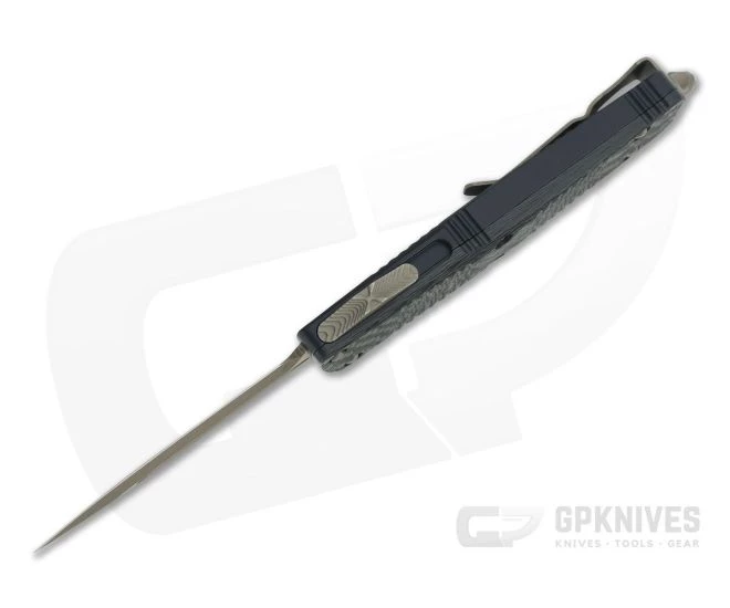 The Microtech Knives Troodon out the front automatic knife is a substantial tool while still retaining a compact size that can be easily carried every day. This knife is elegant enough for dress carry while being a fully capable cutting tool. The Troodon is named after a bird-like dinosaur from the Campanian Age and is ready to strike. This Signature Series version is equipped with a double edge blade of tumbled and bronzed CTS-204P, black hard anodized frame, Carbon Fiber top and bronzed hardware.