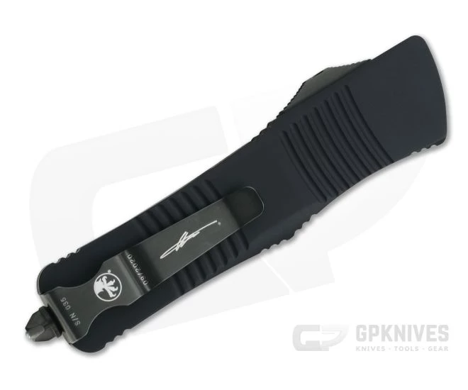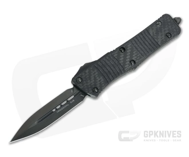 The Microtech Knives Troodon out the front automatic knife is a substantial tool while still retaining a compact size that can be easily carried every day. This knife is elegant enough for dress carry while being a fully capable cutting tool. The Troodon is named after a bird-like dinosaur from the Campanian Age and is ready to strike. This Signature Series version is equipped with a double edge blade of tumbled and DLC coated CTS-204P, black hard anodized frame, Carbon Fiber top and DLC coated hardware.