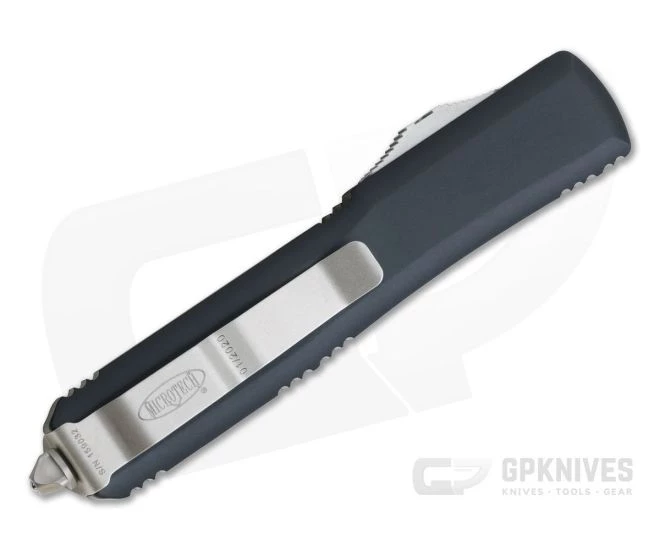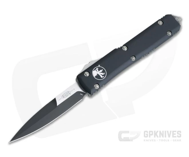 The Ultratech dual action out the front automatic knife from Microtech sets the standard for the category. This version has a black contoured handle, two-tone Elmax Bayonet blade and gray hardware.