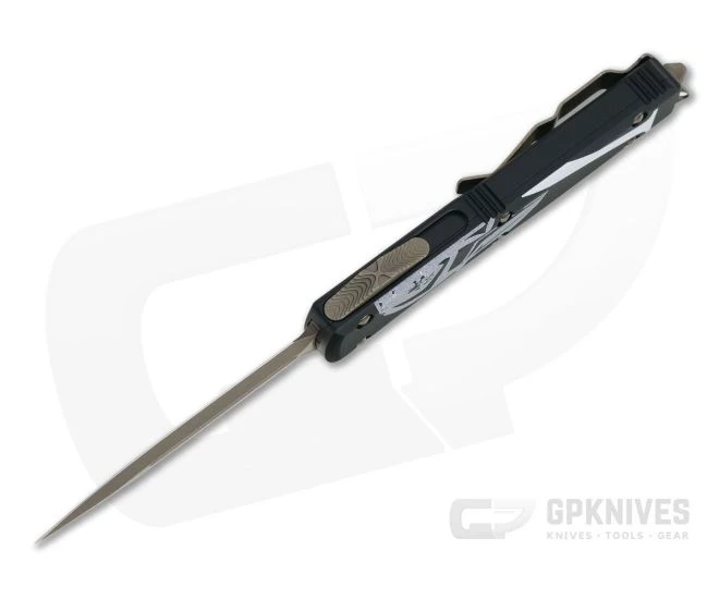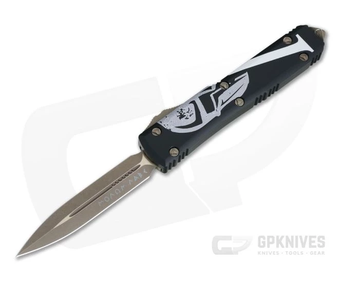 The Ultratech dual action out the front automatic knife from Microtech sets the standard for the category. This “Molon Labe” version has Black anodized handles with laser engraved Spartan helmet and Lambda glyph, bronzed hardware and matching Apocalyptic and bronzed premium stainless steel Double Edge blade.