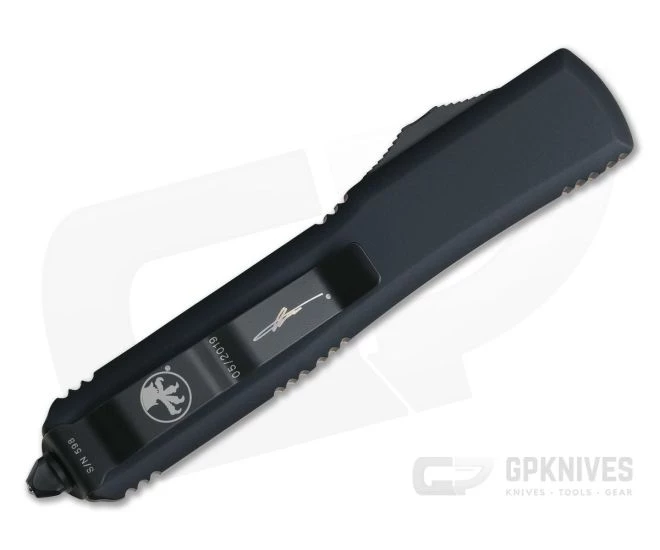The Ultratech dual action out the front automatic knife from Microtech sets the standard for the category. This standout version has a raw copper top and black contoured handle with American CTS-204P, Double Edged dagger-styled blade.