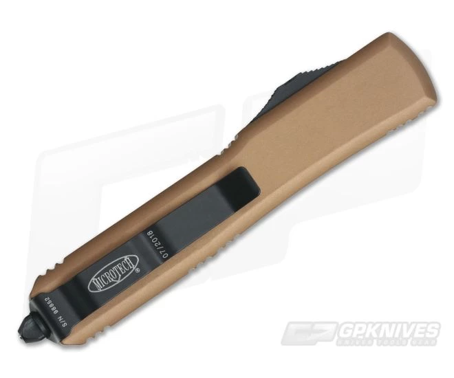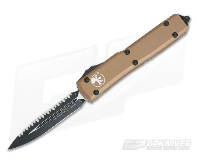 The Ultratech dual action out the front automatic knife from Microtech sets the standard for the category. This version has a Tan handle construction, black hardware and a fully serrated, black M390, Double Edged dagger-styled blade.