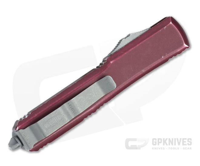 The Ultratech double action out the front automatic knife from Microtech sets the standard for the category. With a sleek yet robust design, precision American made construction and premium materials, the Ultratech is a perfect everyday carry companion. This version has a distressed, Merlot red anodized aluminum handle, Apocalyptic M390 double edge blade and matching hardware.