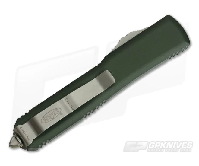 The Ultratech dual action out the front automatic knife from Microtech sets the standard for the category. This version has an OD Green contoured handle and stonewashed, partially serrated, CTS-204P Double Edged blade.