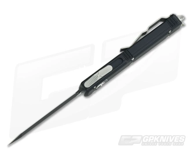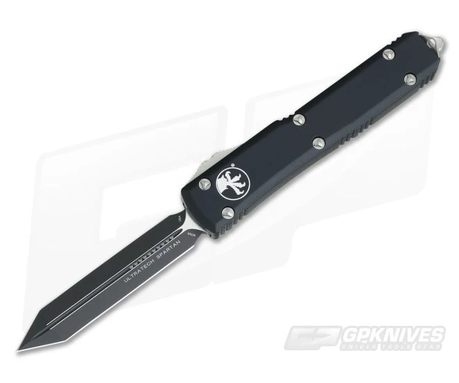 The Ultratech Spartan dual action out the front automatic knife from Microtech sets the standard for the category. This version has a smooth black handle and Standard plain, double edged, Spartan Tanto dagger blade in black DLC coated M390.