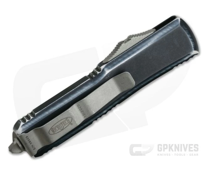 The UTX-85 (15% smaller than an Ultratech or 85% the size of one) double action out-the-front automatic knife from Microtech makes an even friendlier every day carry option. This version has a distressed black hard anodized aluminum handle and Apocalyptic CTS-204P double edge blade.