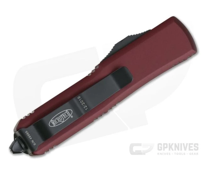 The UTX-85 Spartan (15% smaller than an Ultratech or 85% the size of one) dual action out the front automatic knife from Microtech makes an even friendlier every day carry option. This version has a Merlot anodized, contoured handle, black hardware and a plain edge, black coated M390 Double Edge blade in a Gladius profile.