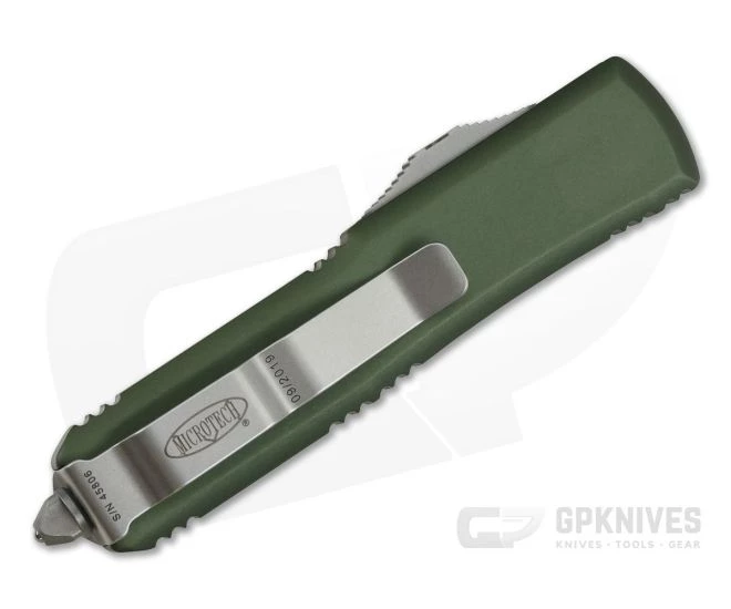 The UTX-85 (15% smaller than an Ultratech or 85% the size of one) dual action out the front automatic knife from Microtech makes an even friendlier every day carry option. This version has an OD Green contoured handle and a plain edge, stonewash finished, Double Edge CTS-204P blade.