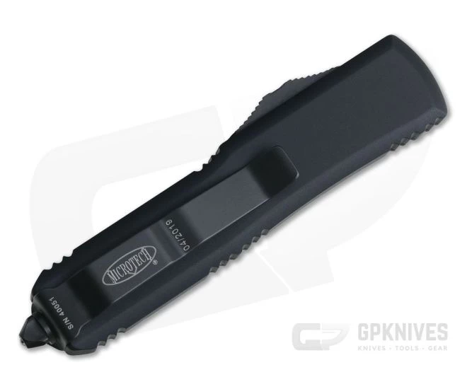The UTX-85 (15% smaller than an Ultratech or 85% the size of one) dual action out the front automatic knife from Microtech makes an even friendlier every day carry option. This “Tactical” version has a black contoured handle, black hardware and a plain edge, black coated, CTS-204P Double Edge blade.