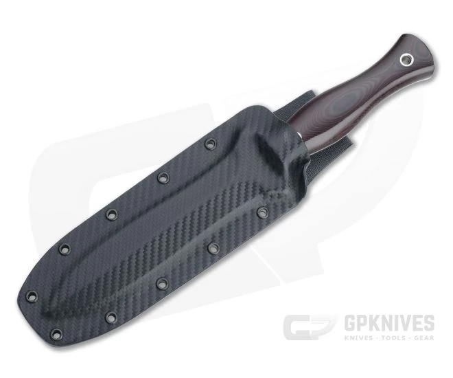 Carries via a 3-layer carbon fiber textured Kydex sheath with integral belt loop and eyelets.