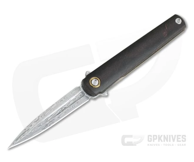 Handle: A simple, tapered and contoured handle is formed from two slabs: striking red Space Coral Carbon Fiber for the front scale and bronze anodized solid titanium for the back with a partial stainless steel back spacer for balance. The uncommon coral carbon fiber delivers a classy look paired with the pattern welded Damascus blade while also reducing the weight for carry. Secure in the grip thanks to the distal taper, the handle is quite comfortable in multiple grip positions. Integral to the back slab, the frame lock mechanism is equipped with a steel lock face insert for smooth, reliable operation and rock solid lock up for the life of the knife. Slotted screw construction and a bronze anodized pivot ring round out the construction.