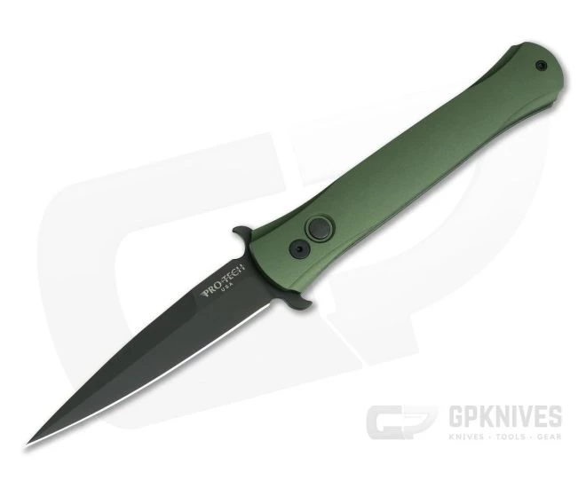 Protech Knives The Don is an full size automatic folder with a distinctive design inspired by traditional Italian folding Stilettos. The Don incorporates Protech’s American innovation of the automatic Stiletto featuring modern materials, high tech manufacturing, advanced coil spring mechanism, and quality American production. This version has a black DLC coated, plain edge blade and smooth, machine contoured Green Hard Anodized aluminum handles.