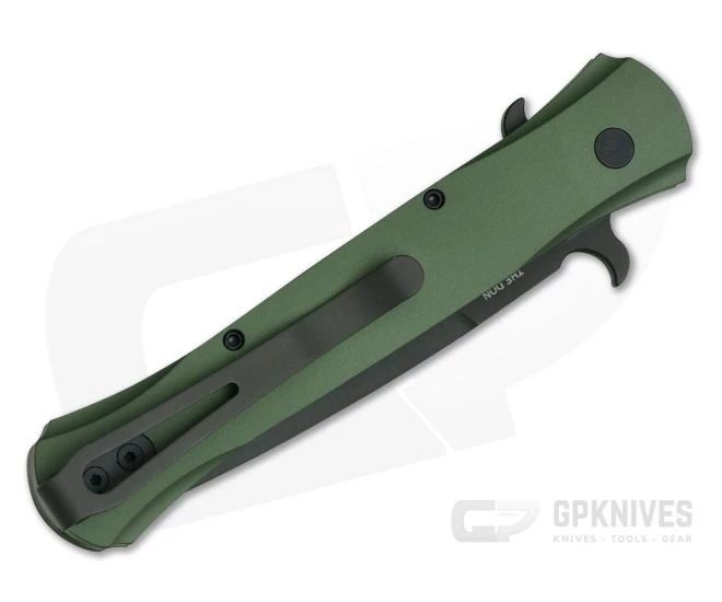 Handle: A contoured, coffin-shaped handle made of Green Hard Anodized 6061-T6 aluminum provides a comfortable in-hand feel in a variety of grips and deploys smoothly from the pocket for use. Machined contours in the handle offer a comfortable grip and visual appeal. Black hardware and rock solid button lock finish off this elegant tactical automatic.