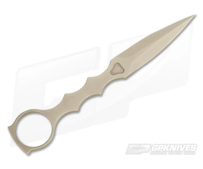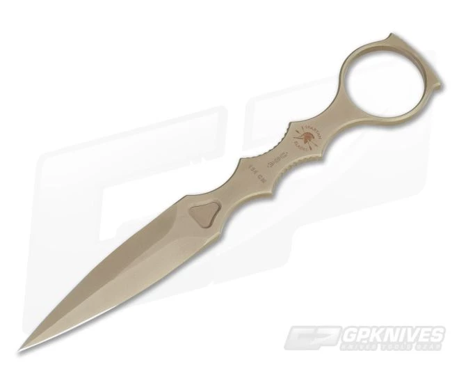 The Spartan Blades CQB (Close Quarters Battle) Tool with the Flat Dark Earth SpartaCoat finish is a “transition tool” for rapid acquisition during grappling situations. The ring and slim profile allow the user quick access in intense moments. The saber ground dagger is a full tang 154CM steel has excellent finger ergonomics and notching for a tight grip. The SpartaCoat ensures long life and durability. The dagger’s ring has an inside diameter of 1.09″ to fit most gloved fingers. The CQB comes with a form fitted desert tan Kydex sheath with matching paracord to lash onto MOLLE/PALS. The sheath is also IWB, Tek-Lok and Mini Tek-Lok compatible (Not Included).