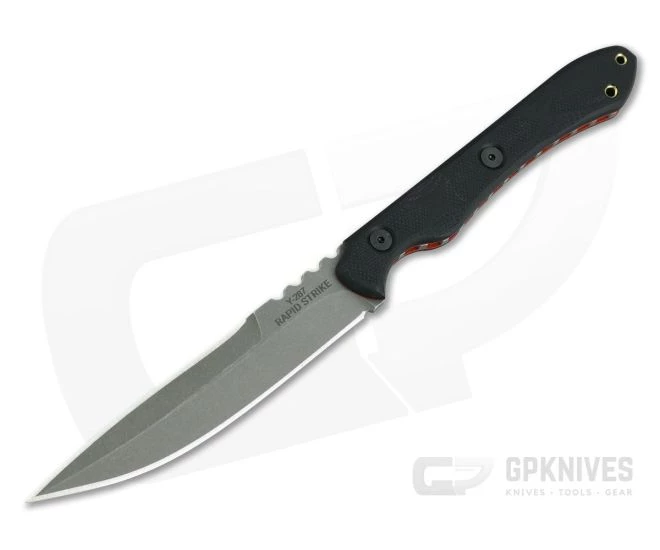 Handle: 3D Contoured G10 handle scales are attached over red liners to the full tang blade with black oxide stainless hardware for added security. The recessed jimping that goes all the way around the handle offers superb traction while maintaining a very slim handle allowing for easy, discreet carry of the knife. The Rapid Strike offers a wide range of carry options and can easily pull double duty as a personal steak knife. An exposed point on the tang can be used as an impact tool or glass breaker.