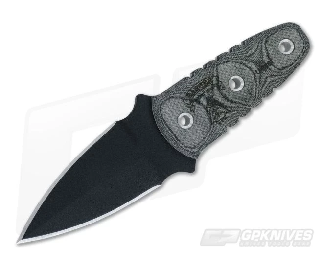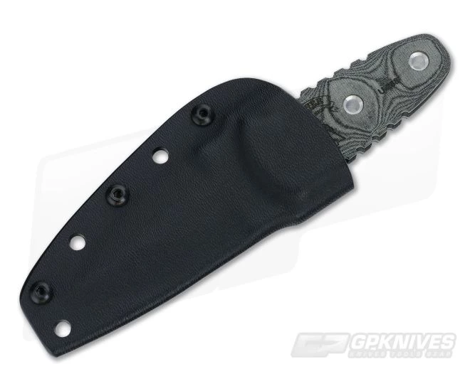 TOPS Knives Ranger Short Stop fixed double-edged blade has a black traction coated 1095 high carbon steel and Black Linen Micarta handle scales. Don’t take this little backup lightly. The Short Stop dagger has twice the cutting power with two sharpened edges and three lashing holes to add more grip. Includes a black kydex sheath with rotating spring steel clip.