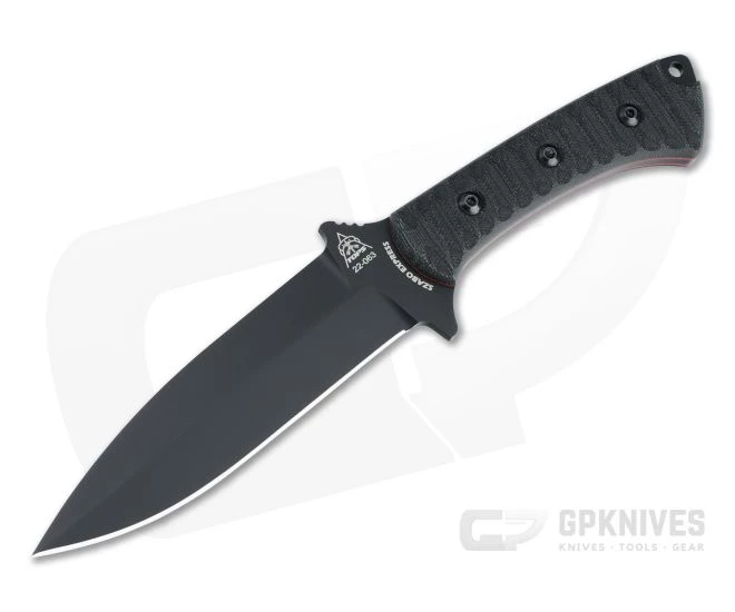 Laci Szabo LEO, U.S. Marine Corps veteran, and martial artist developed the Szabo Express for use in combat and self-defense when unable to carry a firearm. Deploying a fixed blade relies on gross motor skills making it more reliable than a folder in life and death scenarios while being compact to carry and capable of inflicting serious damage. As with his previous TOPS designs (US Combat Knife and Felony Stop) the Szabo Express dagger is a carefully considered and functional tool. Made with black Cerakote 1095 carbon steel and black canvas Micarta this version comes with a single cutting edge.