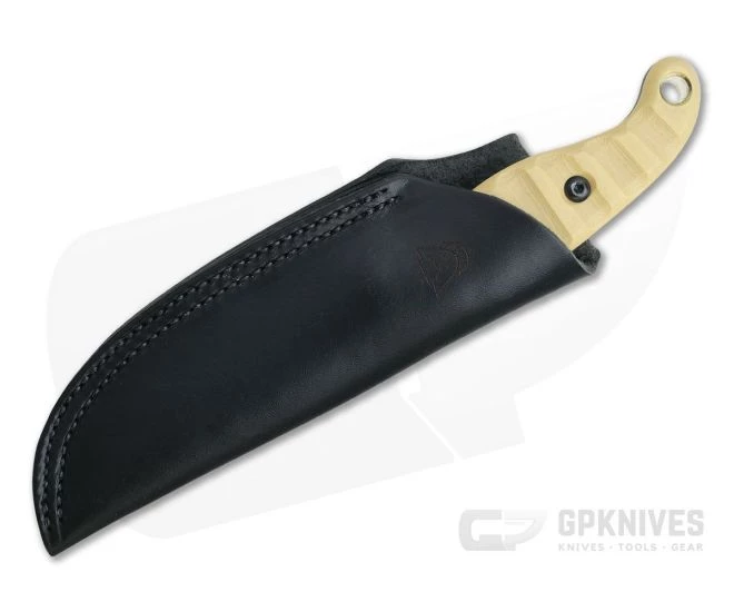 Handle: Antique White paper Micarta handle scales are attached to the full tang blade over white liners and are milled with Rocky Mountain Tread for excellent traction while the contoured edges provide comfort for extended use. The handle design puts the blade slightly below the handle, keeping the point on center, and delivers enhanced efficiency in use. A generous palm swell fills the hand makes for secure use in multiple grip positions while an oversize hollow brass tube allows for lanyard attachment.