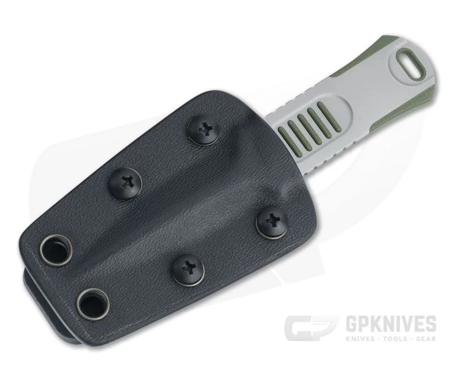 Handle: Inlaid into the tang, the flush G10 scale is no thicker than the tang itself for slim carry. The tang side show G10 ridges in the milled thumb pocket and lanyard hole. The opposite side is coarse textured with both maker and manufacturer logos milled in for added traction. Jimping on the sides with flares at both ends enhances safety on this minimalist handle design. Carries via a molded Kydex sheath with Molle Lok clip attachment.